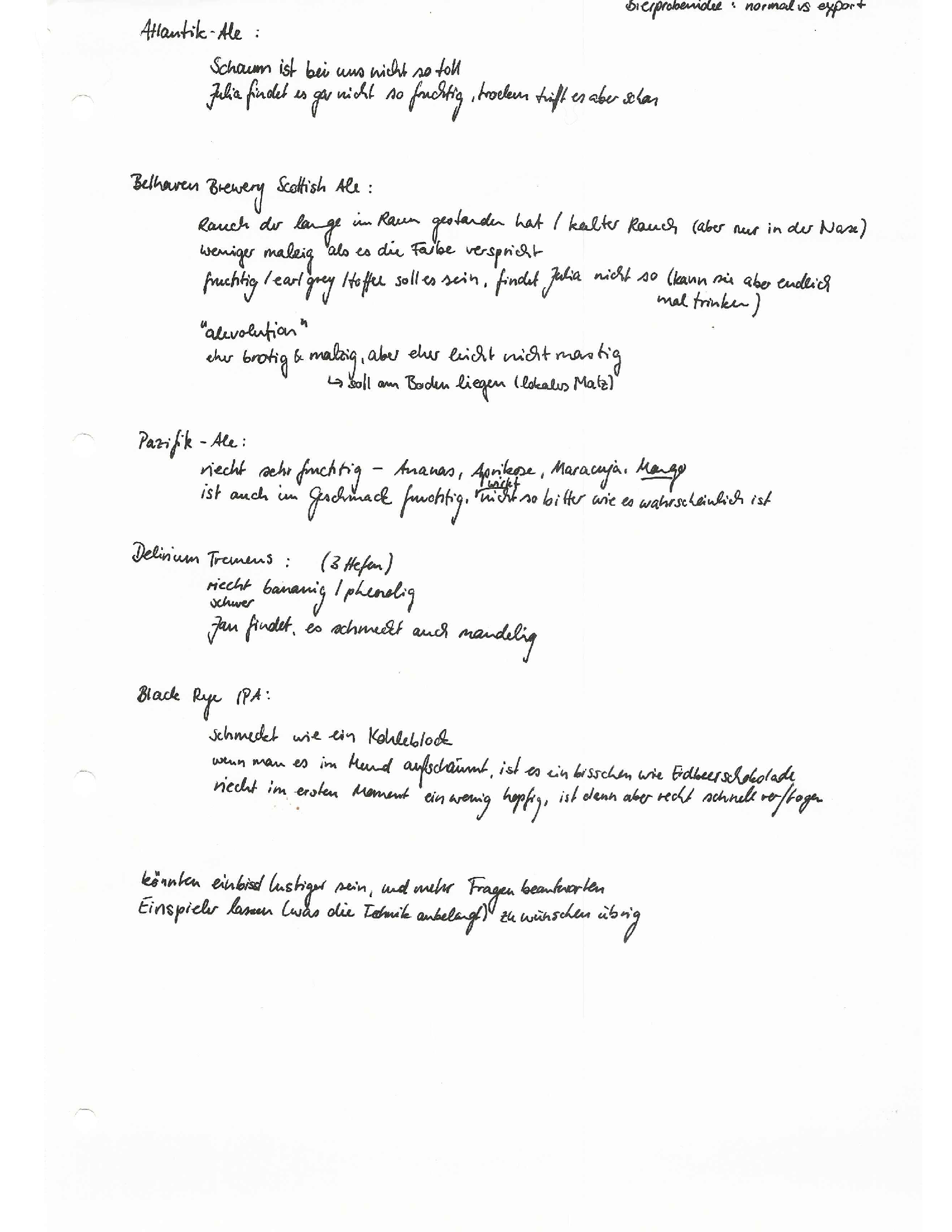 | Lemke Black Rye IPA | Schmeckt wie ein Kohleblock. Wenn man es im Mund aufschäumt, schmeckt es ein bisschen wie Erdbeerschokolade. Riecht im ersten Moment hopfig, das verfliegt aber sehr schnell |