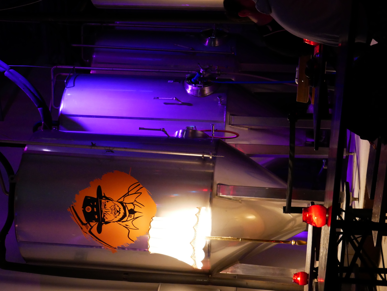 Gebraut wird ganz klassisch im Infusionsverfahren, dafür gibt es einen Maischebottich, der gleichzeitig Sudpfanne ist, einen Läuterbottich und einen Whirlpool-Trog. Letzterer ist fast baugleich mit der Sudpfanne, kommt aber wohl nur für den Whirlpool zum Einsatz. Von dort geht es weiter per Pumpe in die Gärbehältnisse in dem Raum, in dem auch die Gastronomie ist.