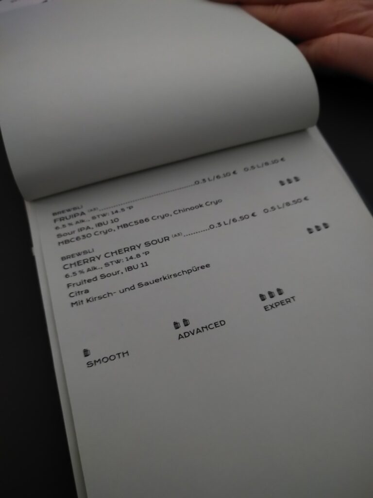 Die Biere sind alle solide, kommen aber nicht über die 70-Punkte-Marke. Das Helle war uns etwas zu malzig. Bei den hopfigeren Biersorten haben Geruch und Geschmack nicht ganz zusammengepasst - vielleicht ein Nebeneffekt der Gläser? Welche Stile sich hinter den Bieren verstecken, entnehmt ihr am besten der Karte: