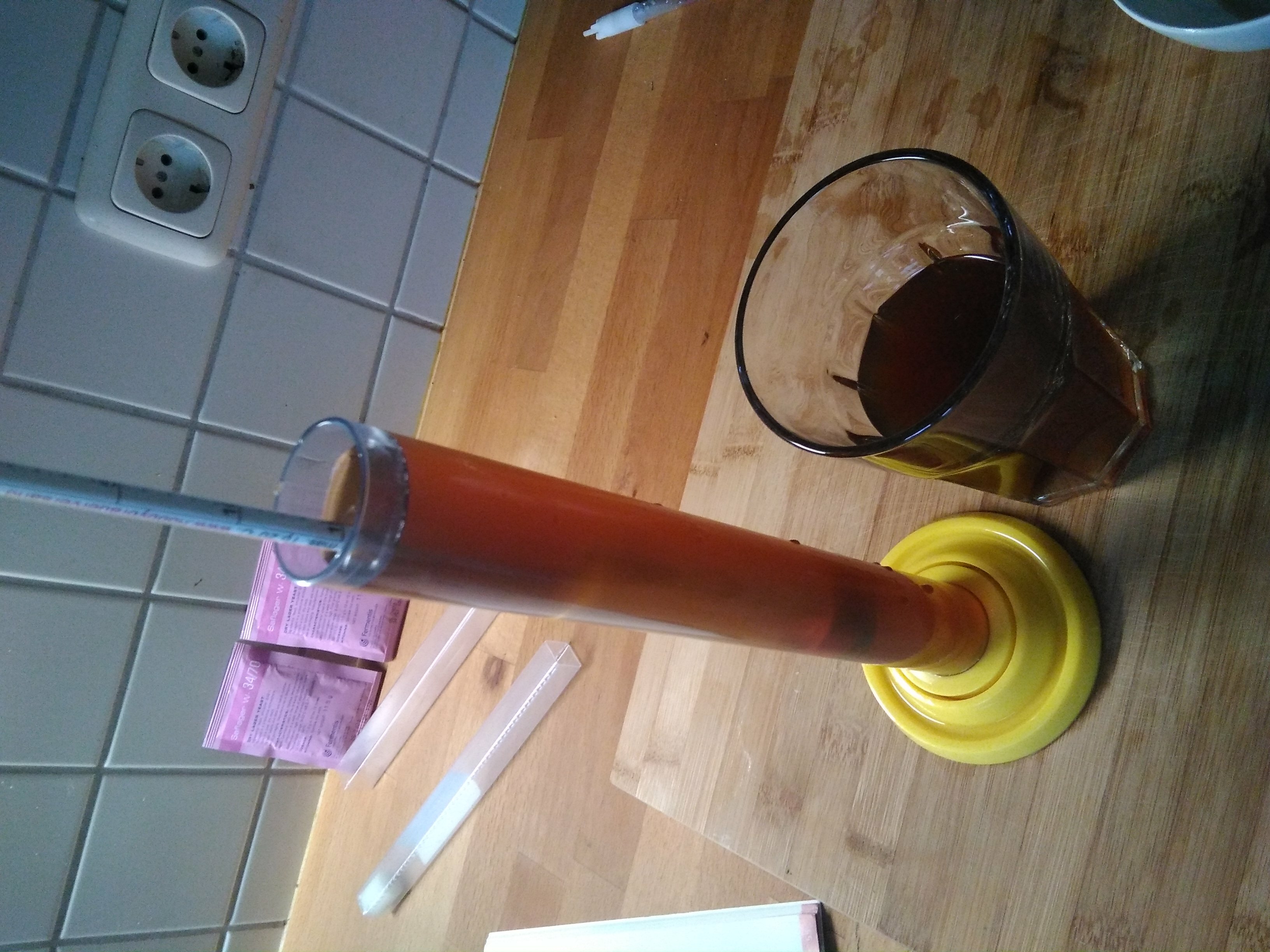 Bei zehn Litern stelle ich mit einer Packung untergäriger Hefe (trocken, 10-11g) an. Mir gefällt die Fermentis Saflager W34/70 sehr gut. Hauptgärung passiert im extra dafür angeschafften Kühlschrank, der Inkbird hält ihn bei 10-12°C. In der Regel dauert das so etwa zwei Wochen. Mitsamt der Speise auf die Flaschen verteilen und dann nochmal 5 Wochen Flaschengärung.